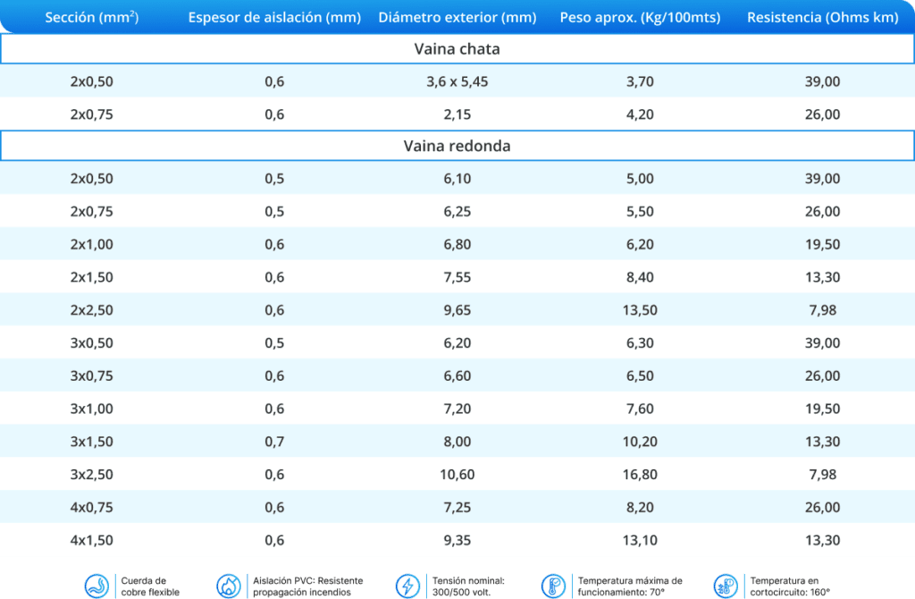 Los conductores son dispuestos en forma paralela y recubiertos por una envoltura penetrante redonda de PVC tipo ST5 extraflexible de excelentes propiedades mecánicas.